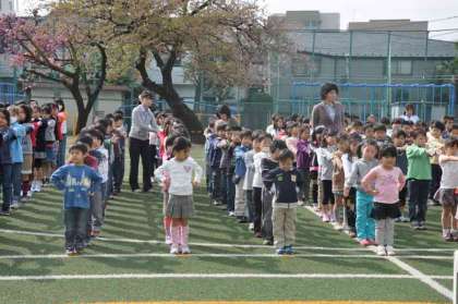 今日から1年生が列に入った朝会です。2〜6年生が、集合時刻前に静かにそして整然と並びました。すると1年生もその行動をお手本に、きちんと並ぶことができました。今朝の校長先生のお話は、大地震発生の伴う、内閣総理大臣並びに文部科学大臣からのメッセージでした。