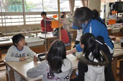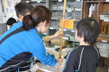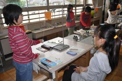 振れ幅を変えて1往復にかかる時間を測定する実験の準備をしています。