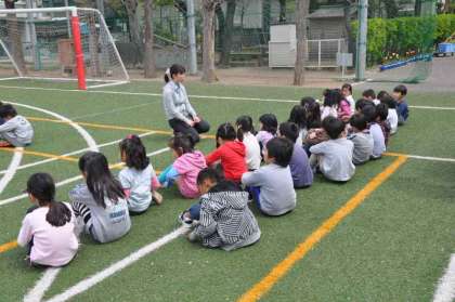 避難訓練終了後、クラスごとに集まって反省をしました。