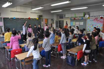 始業前の1年生の教室では、6年生がゲームをしてくれています。1年生は大喜びです。今やっているのは「王様じゃんけん」です。