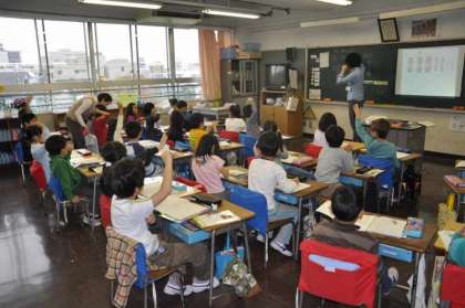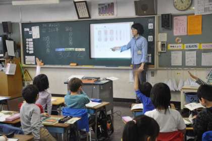 算数の問題を、プロジェクターを使って確かめながら答え合わせをしています。
