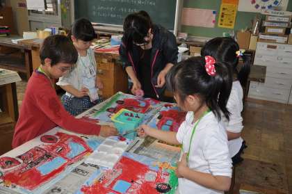 消防写生会の絵を、絵の具を使って仕上げています。