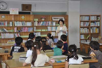 学校図書館支援員による読書指導です。今年最初の時間ですので、図書室の使い方や本の扱い方などを確認しています。