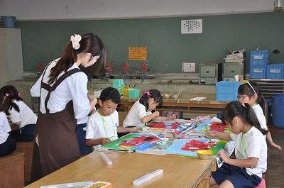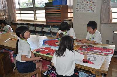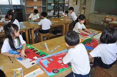 先日の消防写生会で描いた絵を、絵の具を使って完成させています。