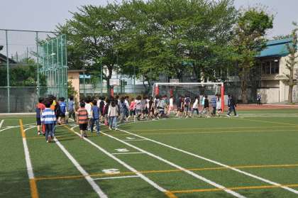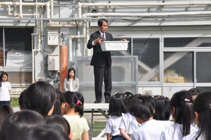 五月晴れの中で、児童朝会をおこないました。校長が「人権の花」と「連休中の過ごし方」の話をしました。