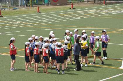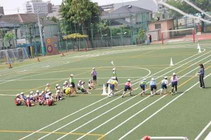 チームごとにバトンを受け渡す練習をしました。その成果を生かしながら実際に走ります。
