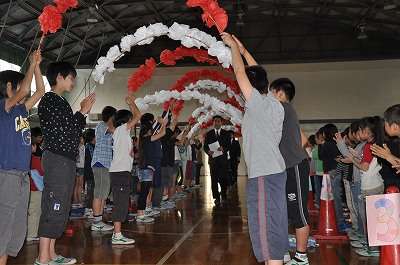 平成23年度の離任式が始まります。まず、入場です。その後、校長から紹介がありました。最初は5人でしたが、最後には6人の先生が参加してくれました。