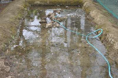 6月に5年生が東松山に出かけ、田植えを体験します。その前に学校の田んぼで田植えをします。その田んぼに水を入れて水漏れがないか確認しました。