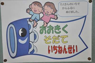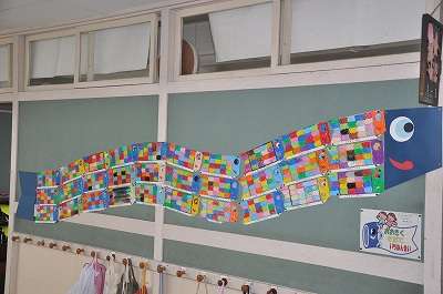子どもたち一人一人が作った「こいのぼり」を合体させて大きなこいのぼりにしています。