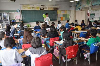 朝のクラスの時間に、運動会で行う演目の説明と練習の準備をしています。