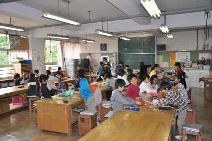 「みんなで、どんどん結んで、つないで」という単元で、木の枝や木片チップで、つるせるオブジェを作ります。