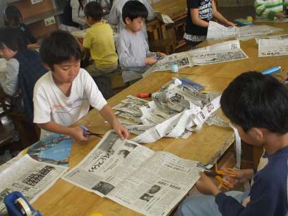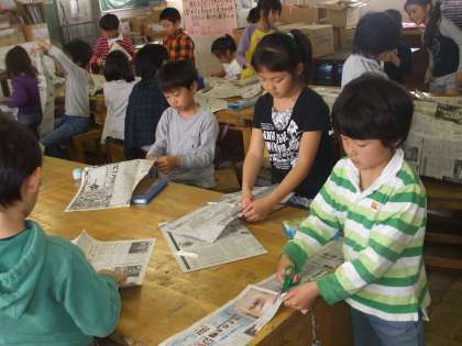 「長い紙、作って」というテーマで、まずみんなで新聞紙を切りました。