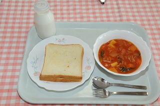 今日は三種類のきのこを、炒めて焼いたパンにはさみました。使ったきのこは、しめじ、エリンギ、榎茸です。また、今日のシチューに入っている小松菜は、世田谷区用賀でとれたものです。とても大きくて立派な小松菜です。