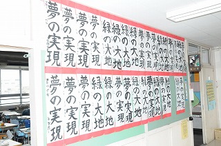 校内書き初め展の作品が廊下に掲示してあります。