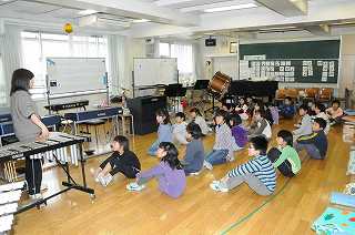 楽器の使い方についての話を聞いています。この後、グループ別の練習に移ります。