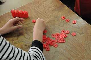 「おはじきがいくつある?」という問題に、数える方法をいろいろ工夫しています。