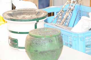 昔の生活で使われていた七輪の使い方を確認しています。