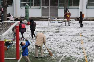 ランドセル広場でたくさんの子どもたちが雪遊びをしています。