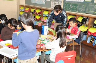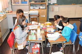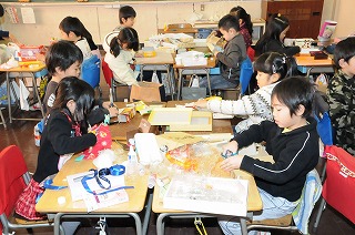 「ゆめのまち さんちょうめ」をテーマに、箱を使って作品を作っています。