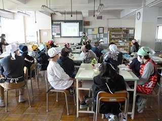 東京ガスの方を講師に、エコクッキングを行います。まず、エネルギーについての話を聞いています。