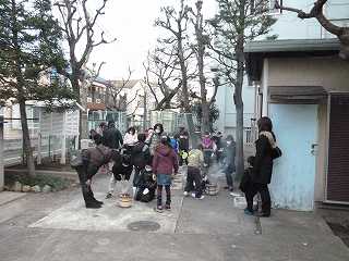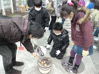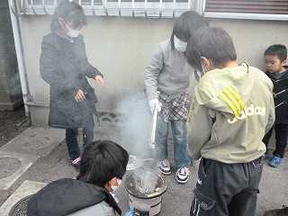 昔の道具を実際に使う体験として、七輪で火をおこします。保護者の皆様にも協力していただいています。