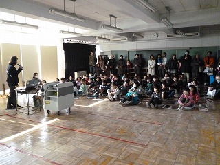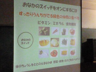 成人病予防協会の方を講師に迎え、「バナナうんちで元気な子」をテーマに、食べ物の大切さの話を聞いています。