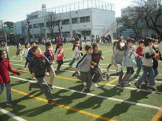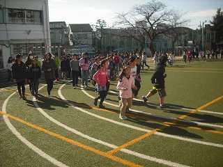 今日は、なかよしマラソンの2日目です。たくさんの子どもたちが、校庭を走っています。