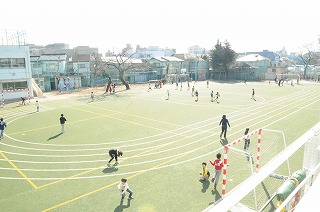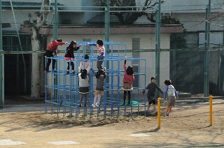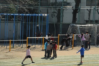 たくさんの子どもたちが、校庭で遊んでいます。