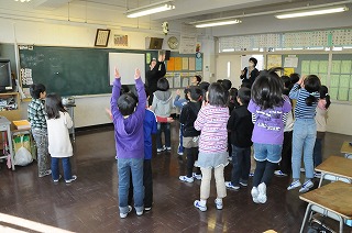 英語の歌に合わせて、体を動かしています。