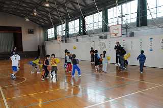 チィアリーディングが終わり、今度はバスケットボール教室が始まります。準備運動の後、ドリブルの練習です。