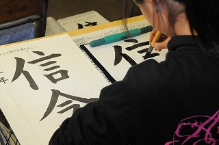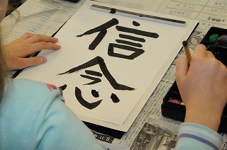 毛筆で「信念」の練習をしています。