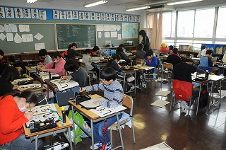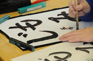 毛筆で「もみじ」の練習をしています。