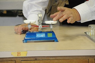 「もののとけかた」で、まず、上皿天秤とメスシリンダーの使い方を確認しています。