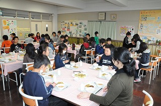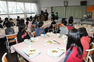 今日は4年2組の子どもたちがランチルームで給食を食べています。