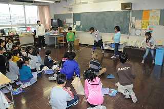昔遊びで、コマの上手な子どもが、みんなの前で回しています。