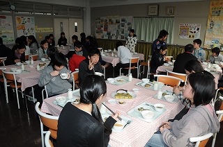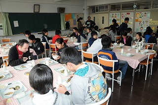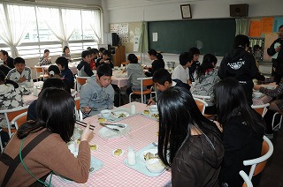 今日は6年2組の子どもたちがランチルームで給食を食べました。