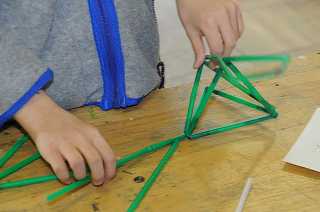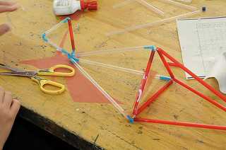 「空をおよぐ魚」をテーマに、ストロ−やモール、セロファンを使って大きな魚を作っています。