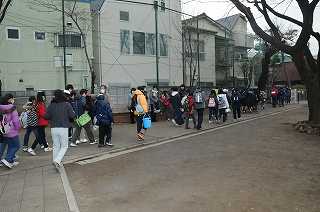 6年生が今日の確認をした後、学校を出発しました。8:00