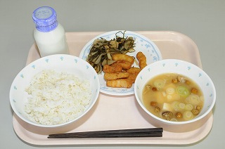みなさん、食器は正しく置いてありますか。ごはんは、左手で持つために左側、みそ汁は、こぼさないように右側に置きます。左利きの人は逆に置いてもいいです。