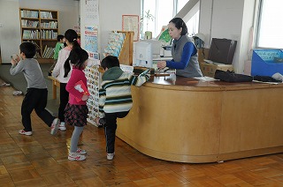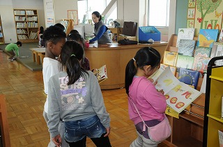 子どもたちが図書室で本を選んで借りています。