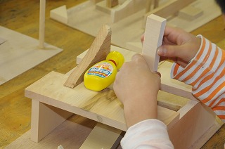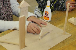 「トーテムポールの町」をテーマに、いろいろな形の木を積み上げて自分だけの町を作っています。