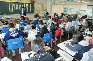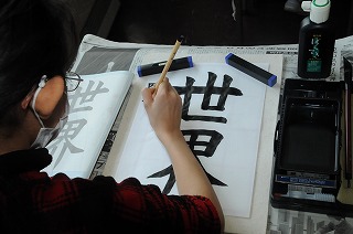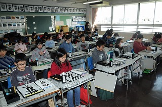 2月24日に実施する東京都小学校書写研究会の研究発表会の事前授業が行われています。「世界」を毛筆で書写しています。