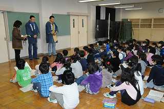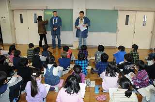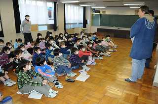 地域の睦会の方に来ていただき、油面水かけまつりについての話をしていただいています。