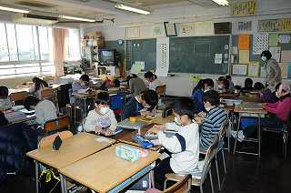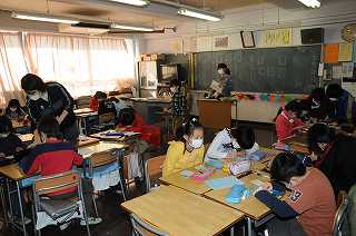 1〜5年生が縦割り班の教室に分かれて、6年生へのメッセージをカードに書いています。