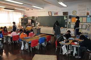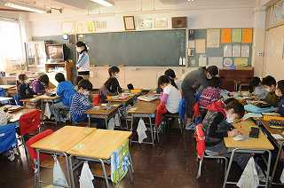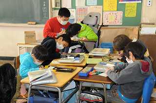 1〜5年生が縦割り班の教室に分かれて、6年生へのメッセージをカードに書いています。