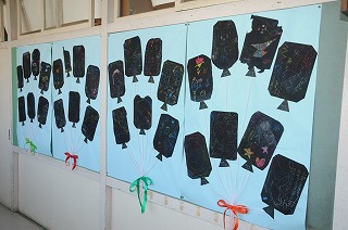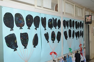 1年生が図工で作った作品が廊下に掲示されています。