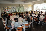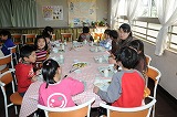 今日は1年1組の子どもたちがランチルームで給食を食べました。
