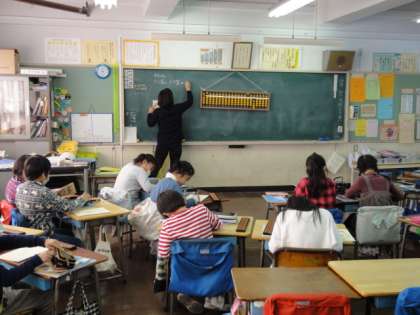 そろばんを使って、たし算・ひき算をしています。