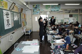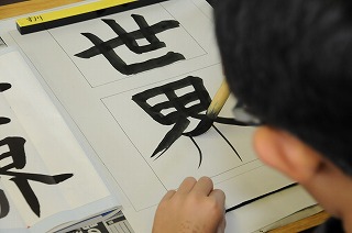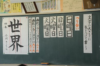 東京都小学校書写研究会の研究発表会の研究授業を行っています。字の大きさなどに気をつけて「世界」を書いています。