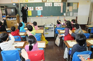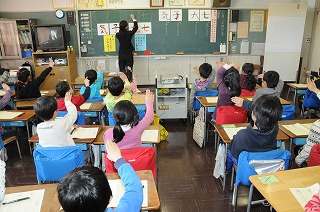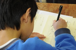 東京都小学校書写研究会の研究発表会の研究授業を行っています。姿勢をよくし、「まがり」や「そり」に気をつけて、字の練習をしています。